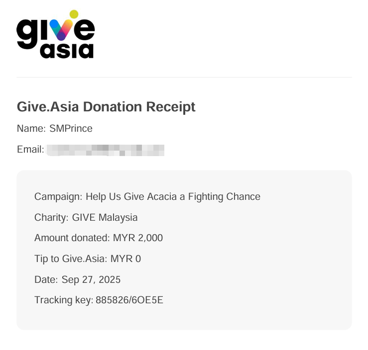 | 27/09/2025 | Help Us Give Acacia a Fighting Chance | MYR 2,000.00 | more |