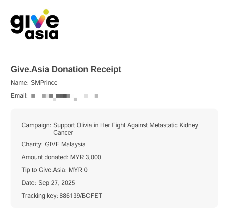 | 27/09/2025 | Support Olivia in Her Fight Against Metastatic Kidney Cancer | MYR 3,000.00 | more |